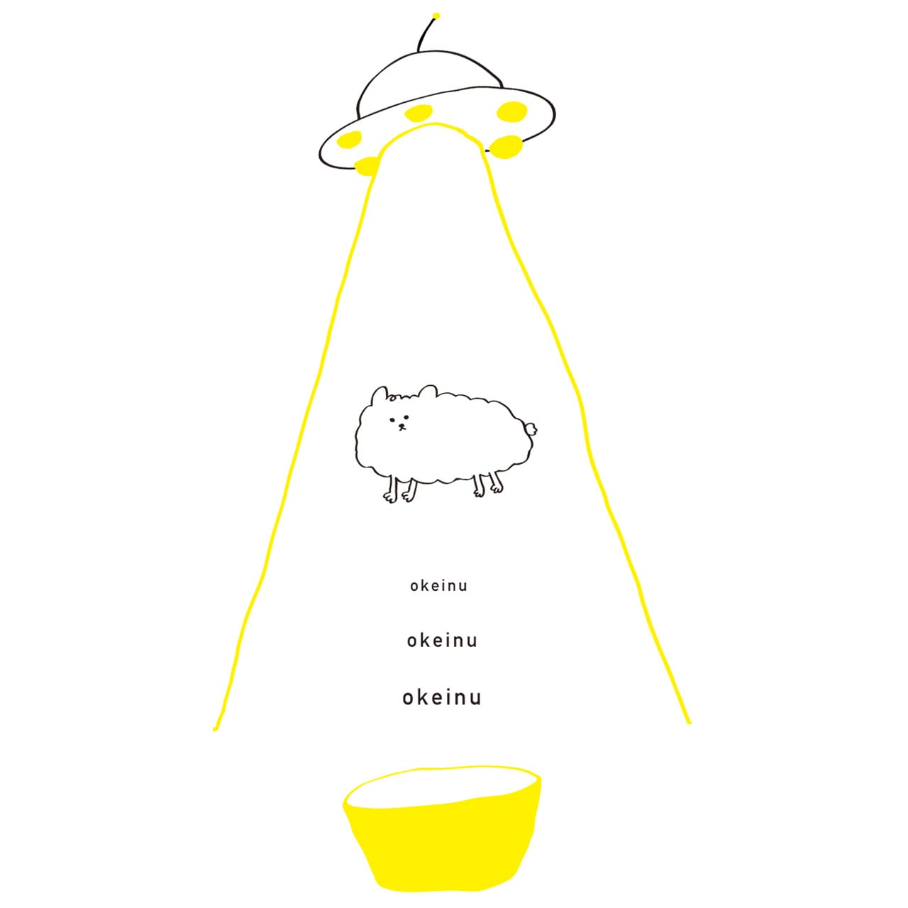 UFOに連れ去られるおけいぬが描かれたシュールなイラストです。